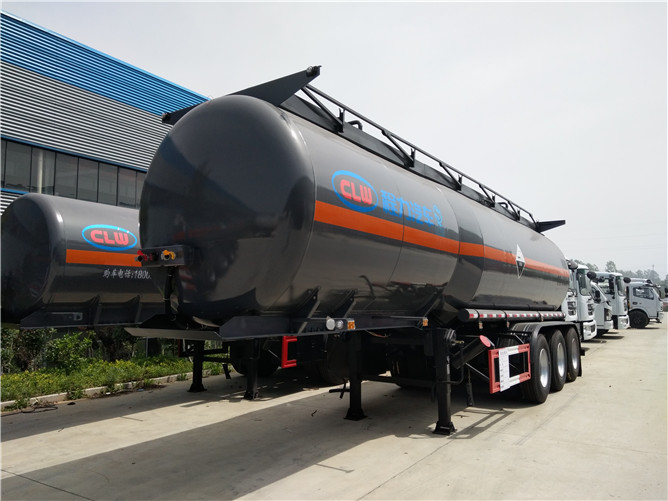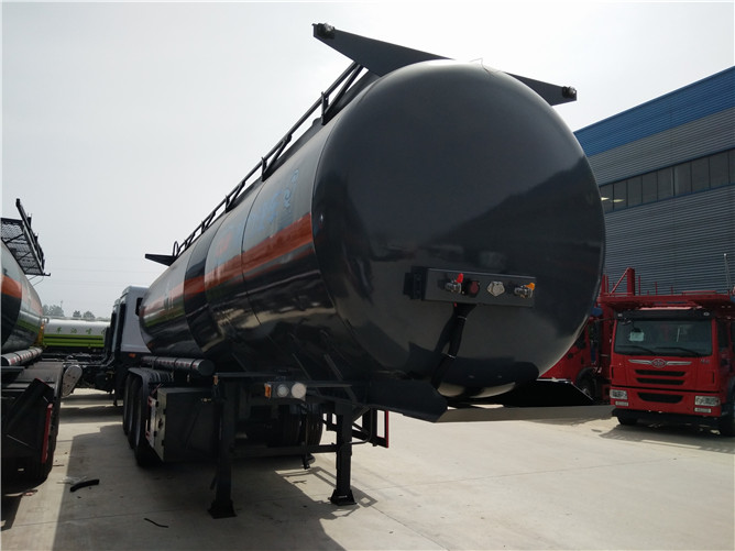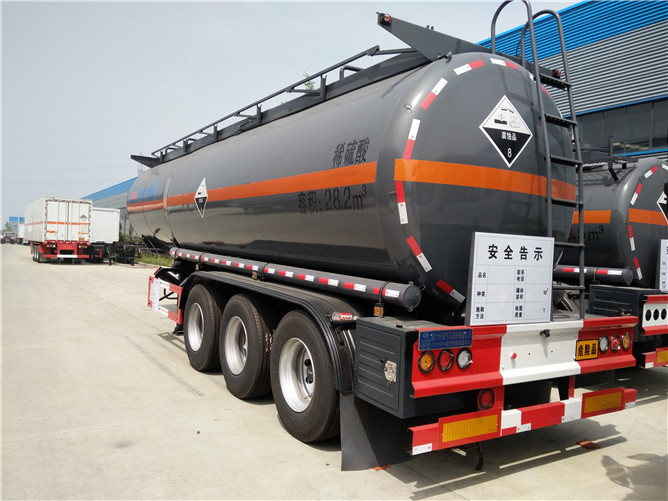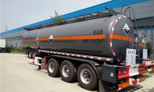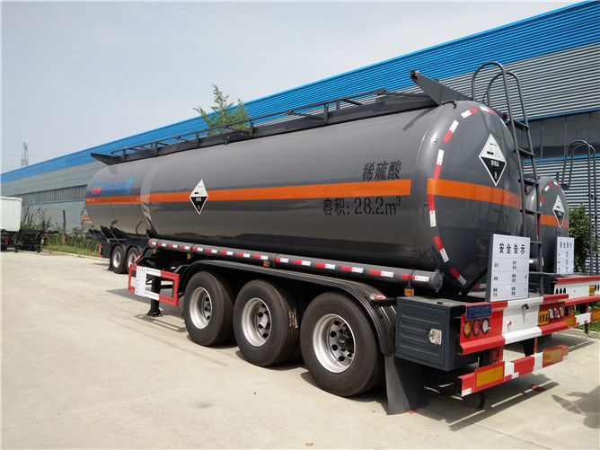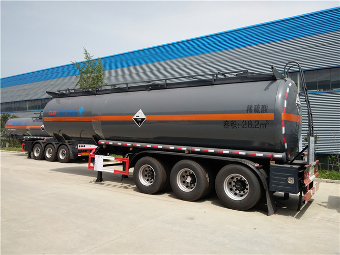 28.2立方稀硫酸半掛車采用Q235板材制作,筒體厚度4.2mm,封頭厚度4.75mm,襯塑16mm,兩個(gè)進(jìn)料口,后尾部左右自流配3寸PP球閥,鋁合金附件,一個(gè)工具箱,一個(gè)備胎架,1200真空胎(鋁合金鋼圈)。