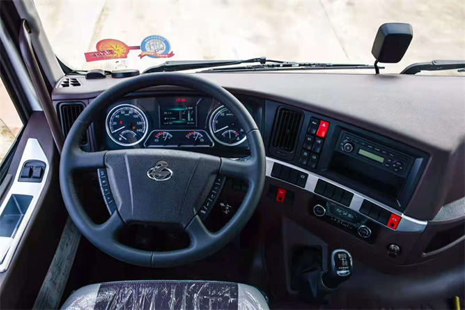 其它配置:液壓機(jī)械翻轉(zhuǎn)、機(jī)械減震司機(jī)座椅、自動(dòng)空調(diào)、定速巡航系統(tǒng)、ABS、車載終端、中控鎖、自動(dòng)調(diào)整臂、多態(tài)開(kāi)關(guān)、真皮多功能方向盤(pán)、前置排氣管、前輪防爆胎裝置、盤(pán)式前橋、排氣火花熄滅器、ECU限速裝置(限速80km/h)、駕駛室電源總開(kāi)關(guān)、導(dǎo)靜電橡膠拖地帶。