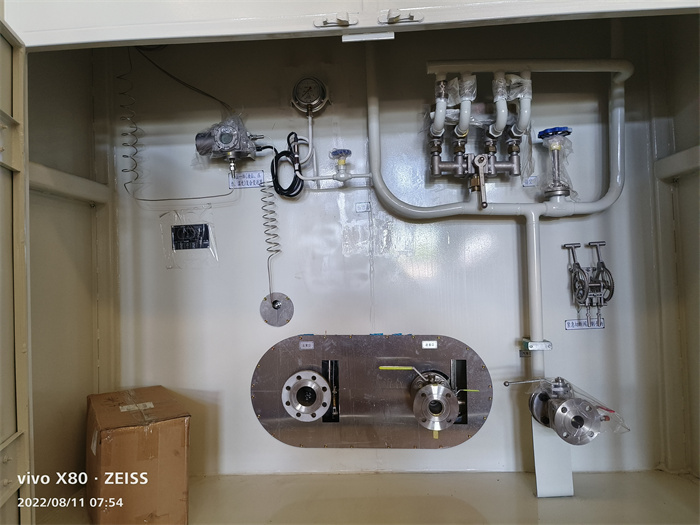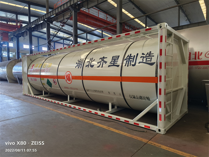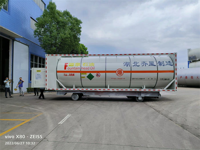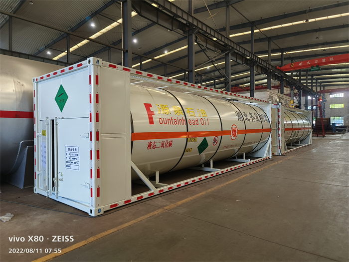 30英尺二氧化碳罐式集裝箱主要由框架、罐體及管路系統(tǒng)等組成,罐體外部采用聚氨脂保溫。筒體和封頭材料均經過檢驗,且進廠后還進行