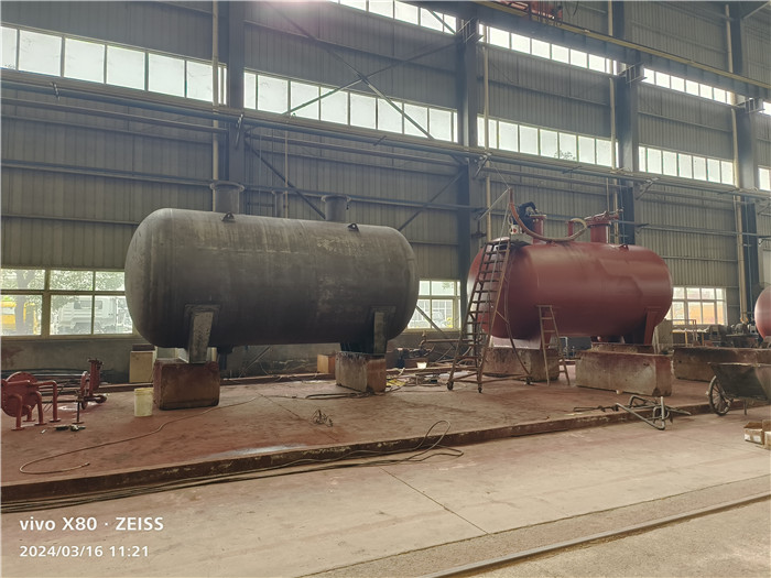 今天上午,我公司壓力容器產(chǎn)品車間水壓試驗(yàn)臺(tái)上兩臺(tái)32立方液化氣地埋罐正在工作人員的操作下裝設(shè)壓力表,為接下來(lái)的水壓試驗(yàn)作準(zhǔn)備。