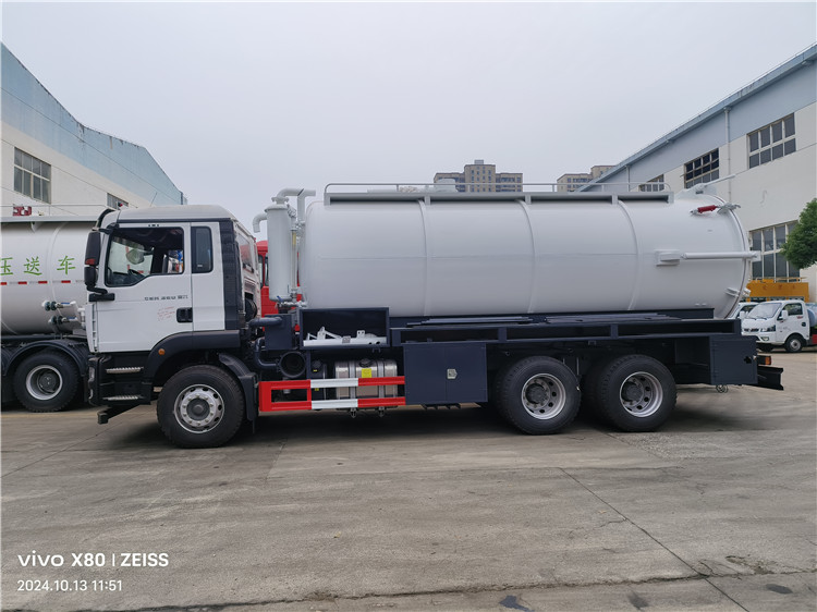 吸污罐:一個散水罐口,罐內(nèi)帶爬梯,罐體內(nèi)部用防浪板加固,水循環(huán)泵水箱為碳鋼材質(zhì),副駕一側(cè)為DN150鋁合金球閥,吸污罐尾部裝有DN600排污口,尾部左側(cè)一個DN150排污口,右側(cè)一個DN100的進(jìn)料口,一個DN100鋁合金排污口,側(cè)邊一個DN100排清水,罐體尾部兩側(cè)工具箱,1根10米吸污管,箭頭燈,手動油門。